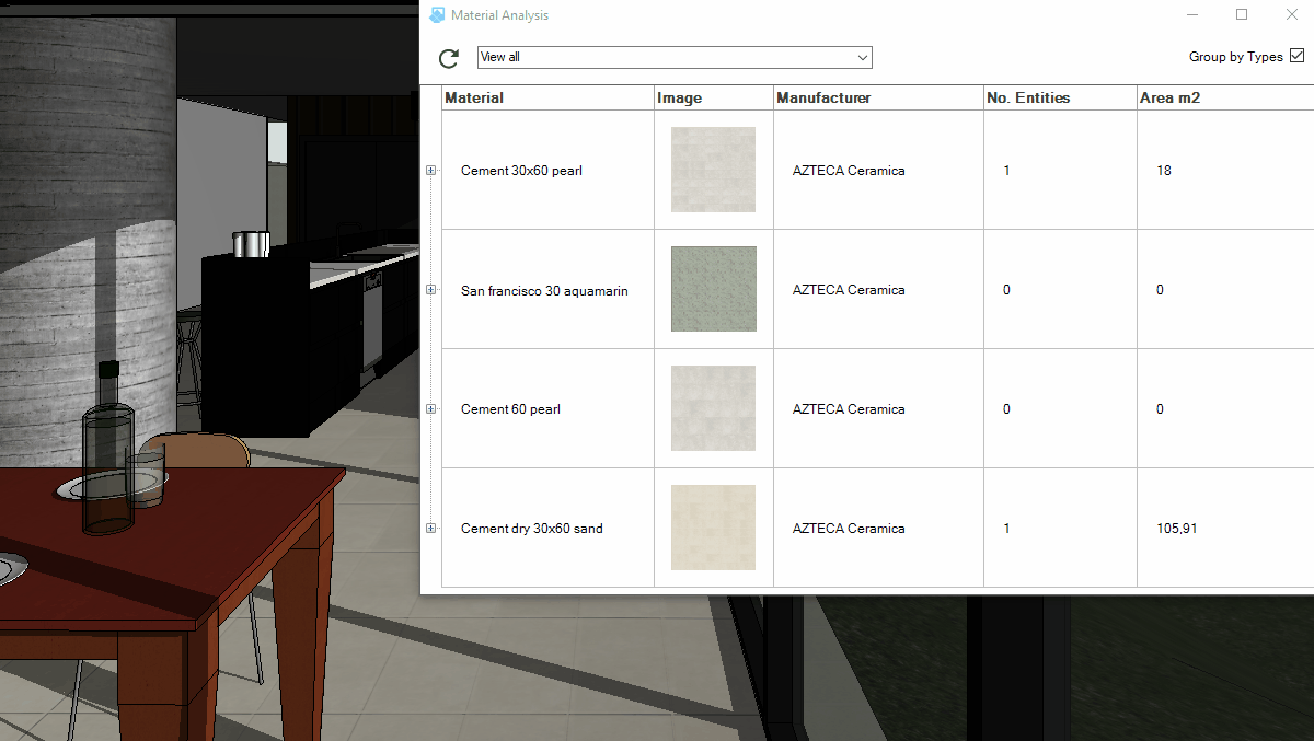 con este comando puede obtener los materiales UpdateBIM incluidos en el proyecto y la cantidad de metros cuadrados utilizados en cada construcción del edificio, por ejemplo, en el proyecto de muestra, colocamos materiales en el suelo de la cocina.